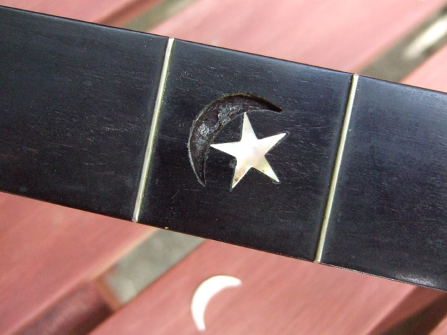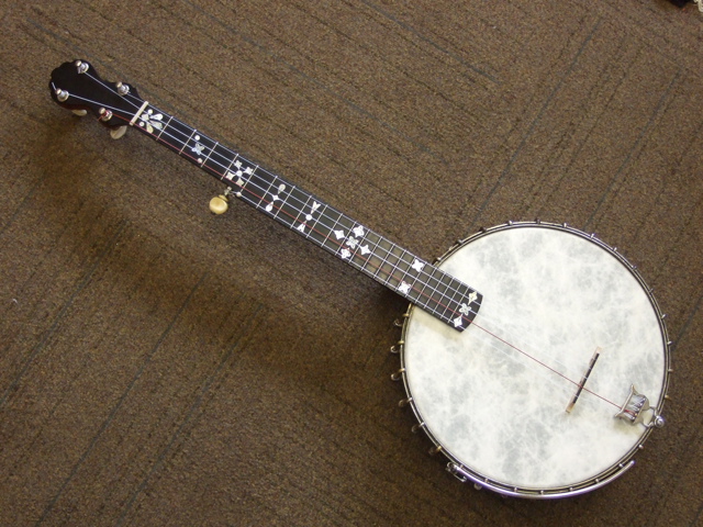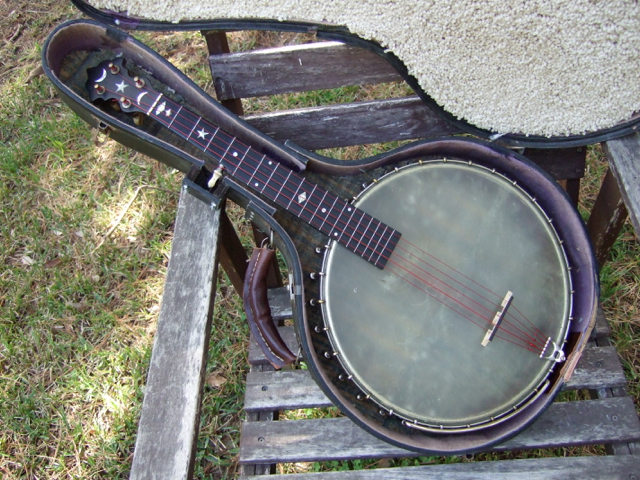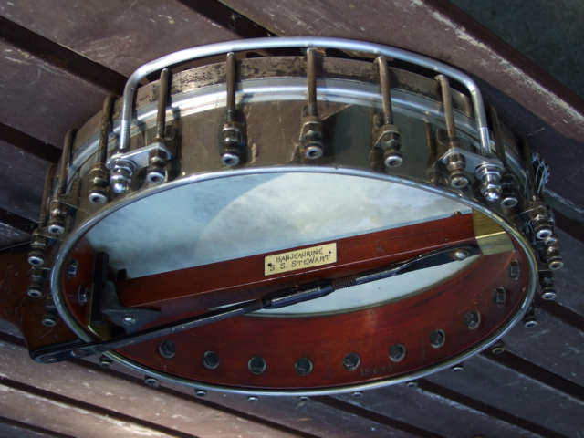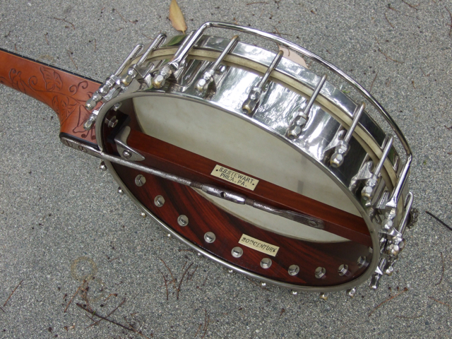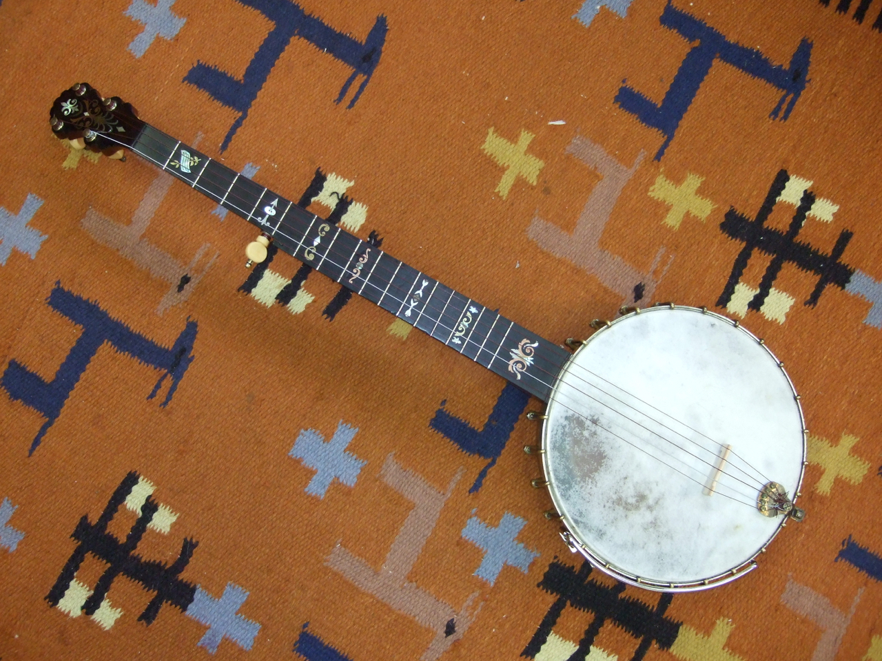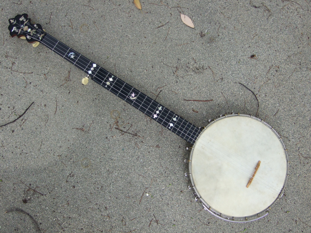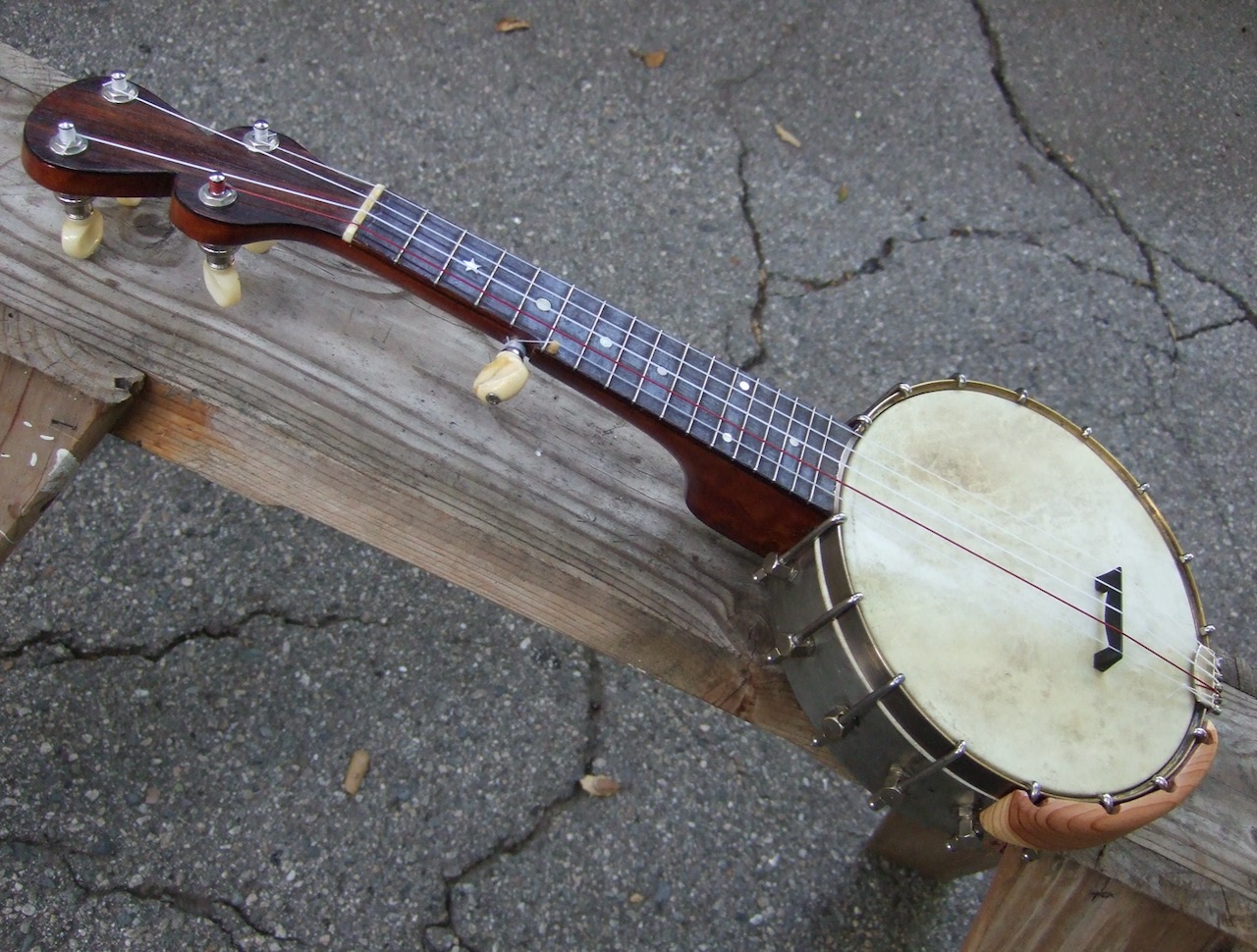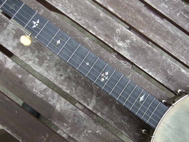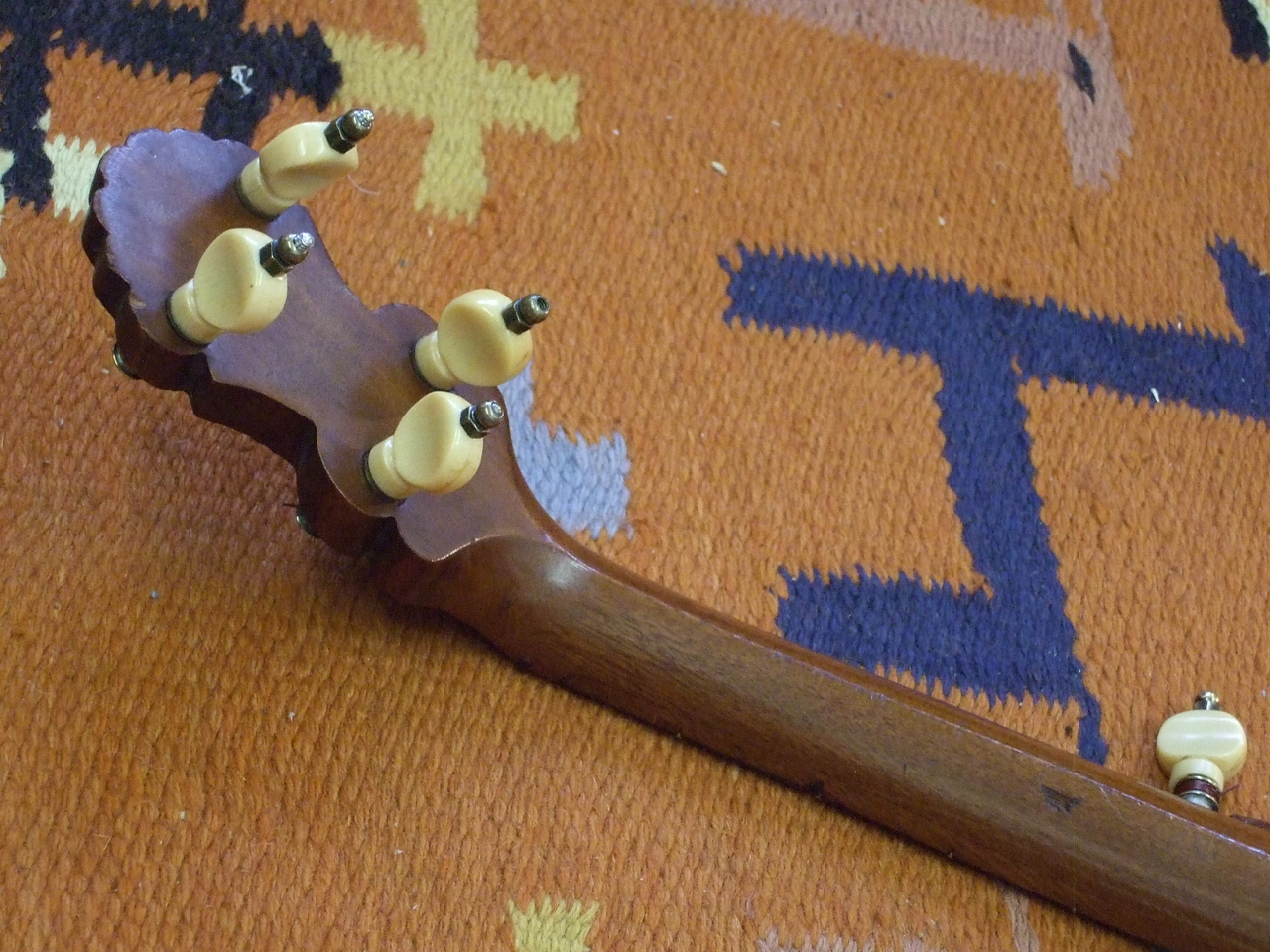 July 2015: Perhaps hoping to tap into the excitement attending the approaching turn of the century, Sam Stewart introduced a new model in 1896, The 20th Century. The ad copy read "Up to date... and a little in advance" -- reasonably priced at $30 but "the best instrument for the money manufactured." Steward didn't make it but died suddenly in 1898, at the age of 43. By its serial number, this particular instrument was made within a few months, plus or minus, of his death. The previous owner who actually played it had it for over eighty years, bought used in the 1920's. It came to me missing one moon and the ebony neck wedges, a bit tarnished, but overall in good shape.