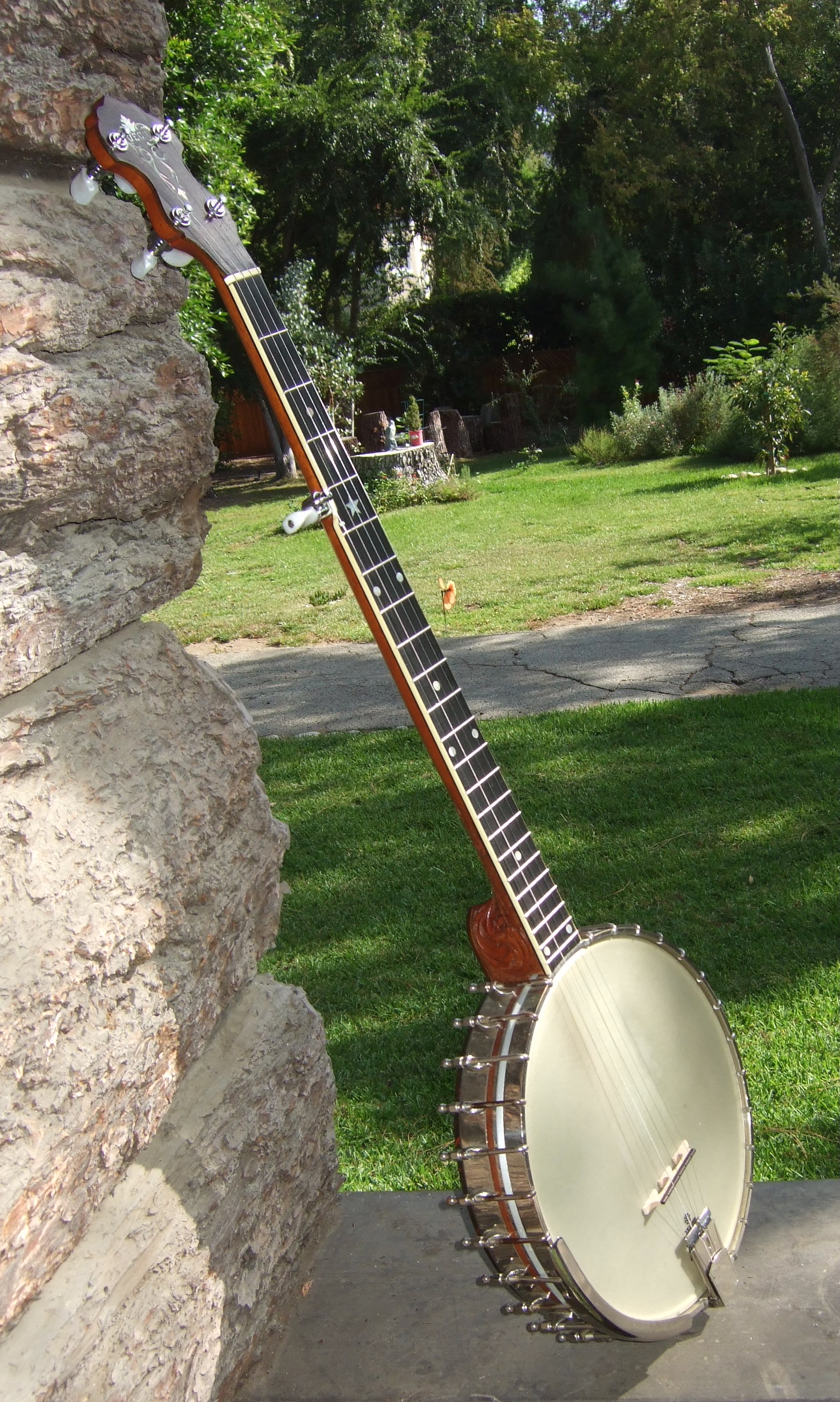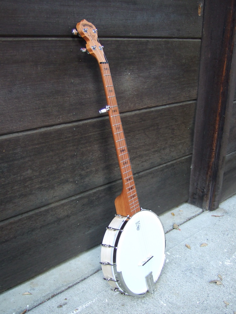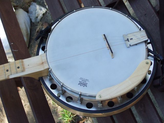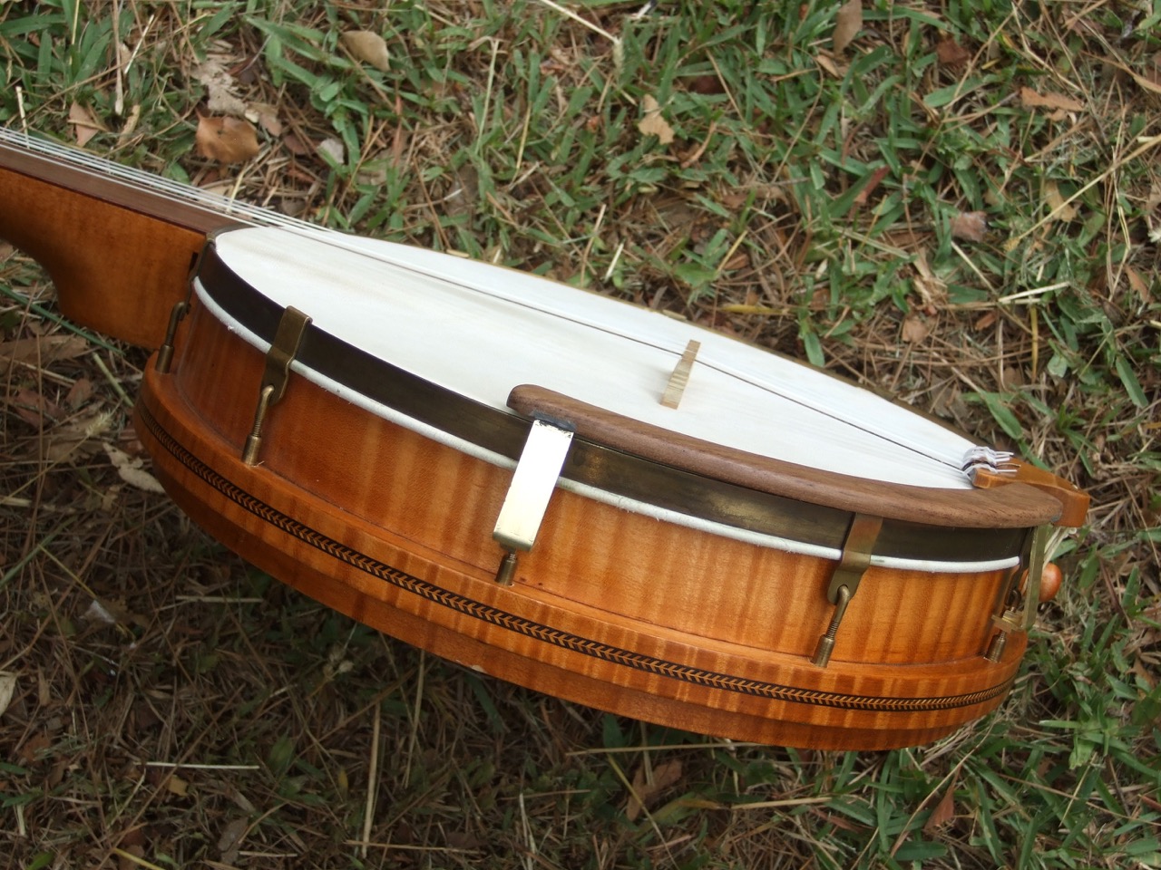 What is the fate of all those research-grade banjos? Some re-up, hooked on the research thing. Others, like this one, opt for luxurious retirement. With many swappable parts, they end up in a variety of combinations. This one has a mahogany blank fashioned into a Deering Goodtime neck (on the Deering CNC machine). The rim is 5/16in cherry, having started out as a drum shell. Arm rest and tailpiece are home made. The bridge is by Bart Veerman. The rest of the hardware is stock Deering.