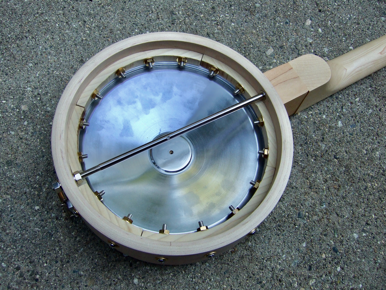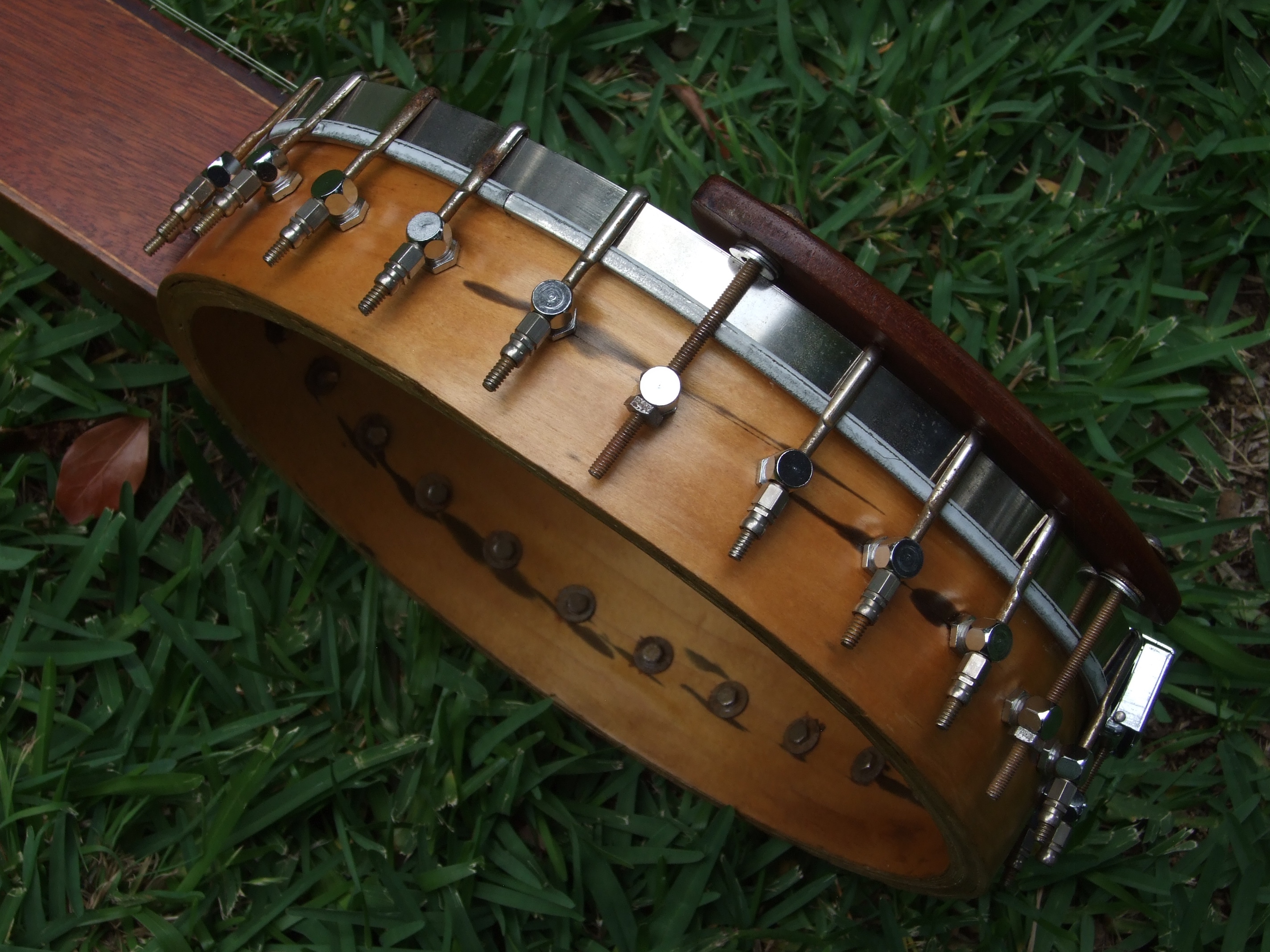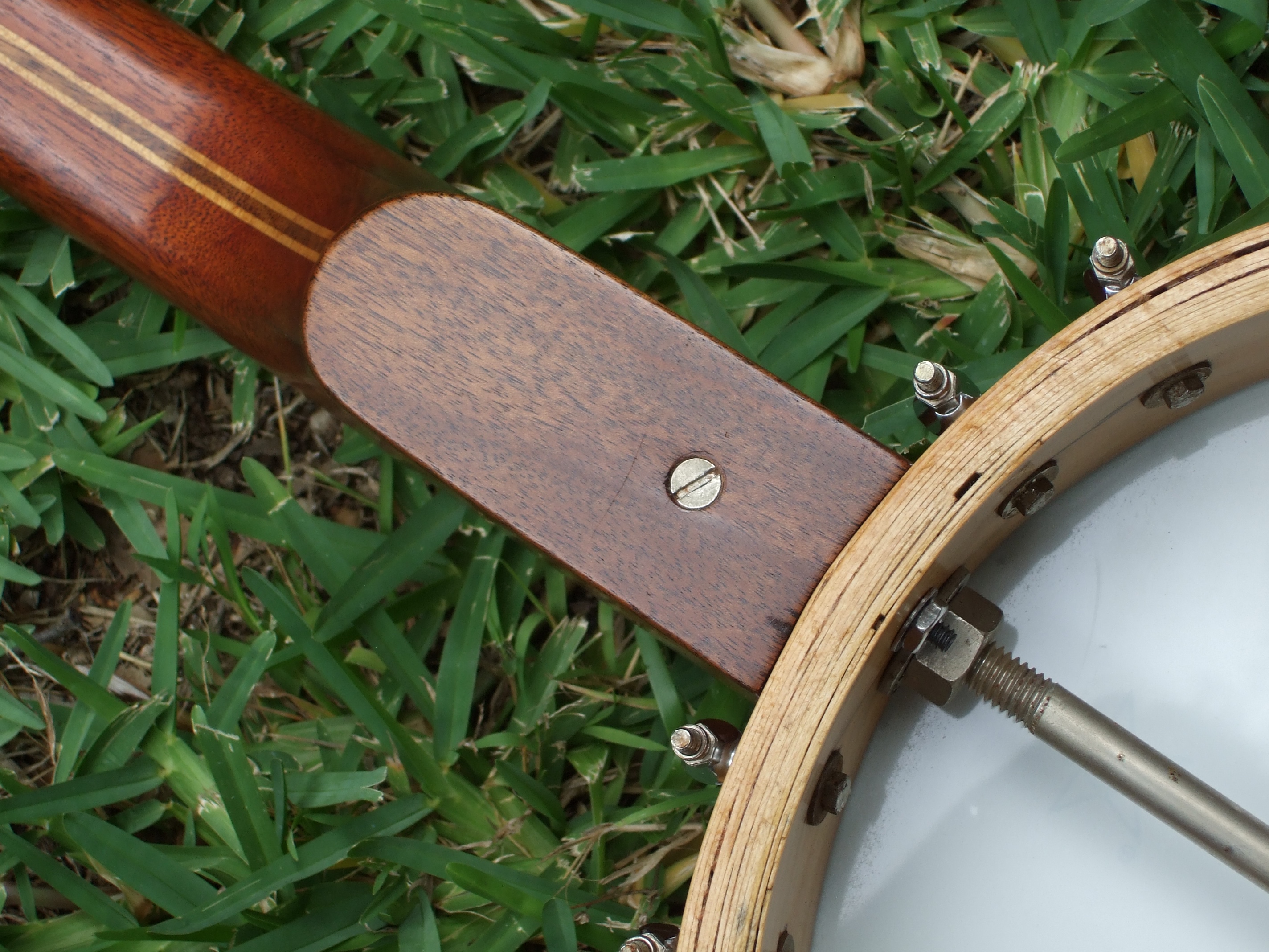 I built my first banjo when I was 15, using hand tools and a lathe and band saw at school. Tuners, fret wire, hooks & shoes, tailpiece, and head came from a local music store. Homemade brass parts were nickel plated by a family friend. It was my only one for about a dozen years. I only now cleaned it up from severe flood damage of about 15 years ago, also adding a hanger bolt to better secure the neck.