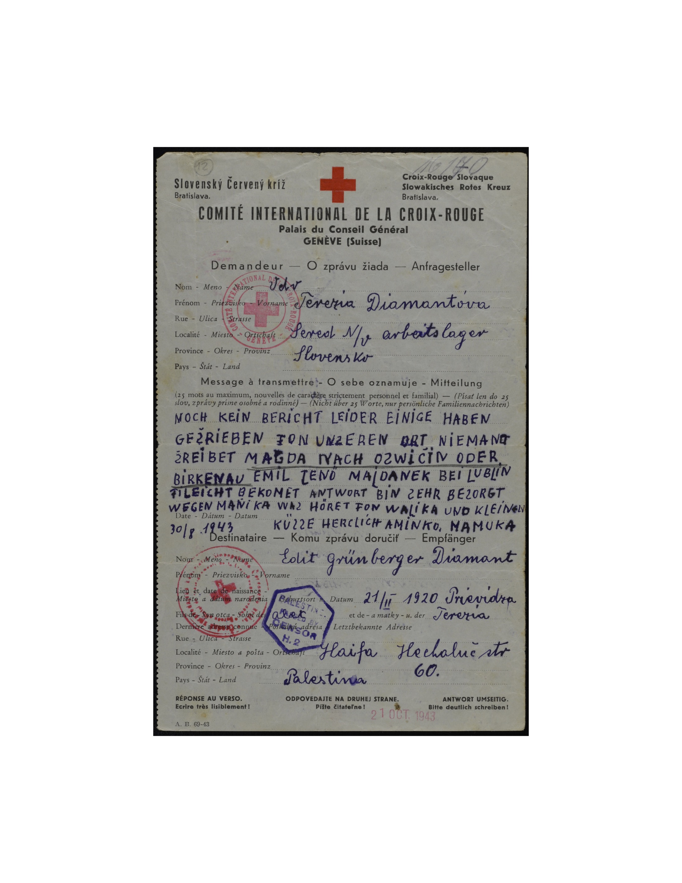 A somber note for somber times: While reading Heather Dune Macadam's 999, I searched on-line and came across one of the items contributed to Yad Vashem by my cousin, Gila Benjamini. It is an attempt by her mother to communicate to our grandmother, then in Sered (a concentration camp in Slovakia), regarding the whereabouts of our youngest aunt, Magda (then a teenager). The reverse side, intended for a response (as per instructions at the bottom), is blank.