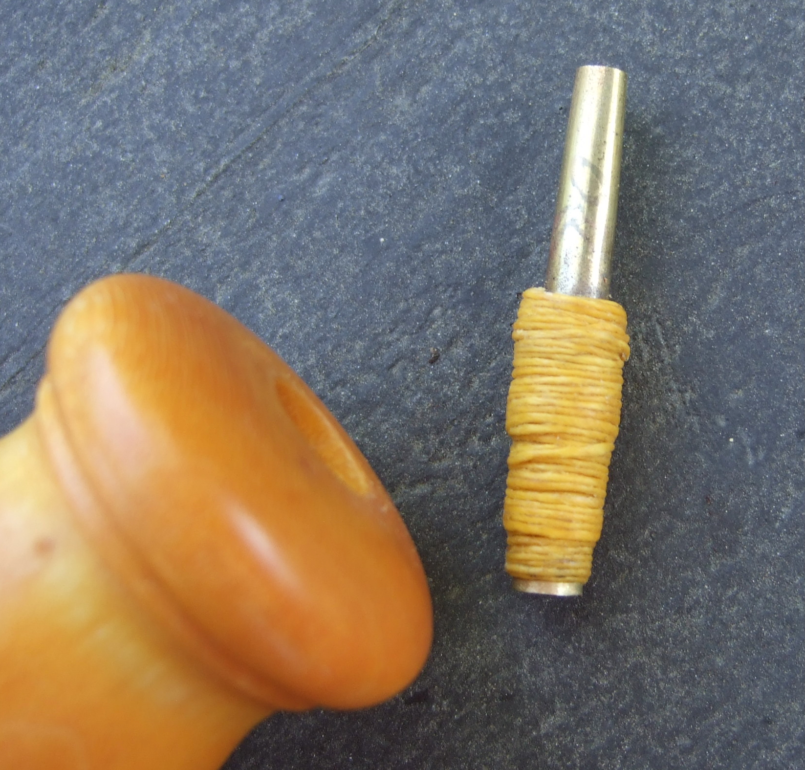 A DIY staple: waxed linen left over from bagpipe restoration and two precise bits of brass tubing, soldered. "Go for baroque!"
